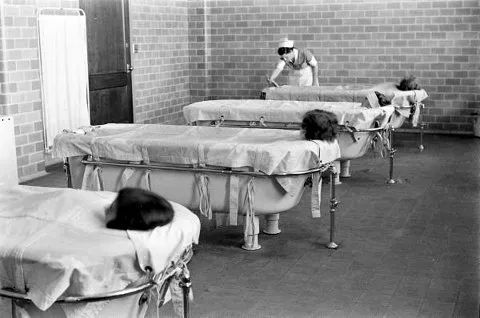 A día de hoy la hidroterapia puede parecer un método agradable, incluso relajante, pero en la psiquiatría del siglo XX adquirió formas mucho más duras. Las duchas, las envolturas húmedas y los baños terapéuticos se aplicaban con agua extremadamente caliente o, en el extremo opuesto, con agua helada e incluso con hielo. Lejos de ser un tratamiento relajante, se concebía como una técnica de choque destinada a provocar una respuesta fisiológica intensa.